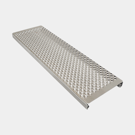Die PcP. Sicherheitsstufen OPTIMO™ O2™ ist eine in Ihren Abmessungen kompakte Lochblechstufe aus 2 mm Stahlblech. Die Anschraublaschen sind Bestandteil der Stufe und eine separate Antrittskante ist durch die rutschhemmende Lochung bis zur Stufenkante nicht notwendig. Durch die Einrollung der unteren Stufenkanten kann die Stufe trotz Ihrer kompakten Abmessungen enorm hohe Lasten aufnehmen.