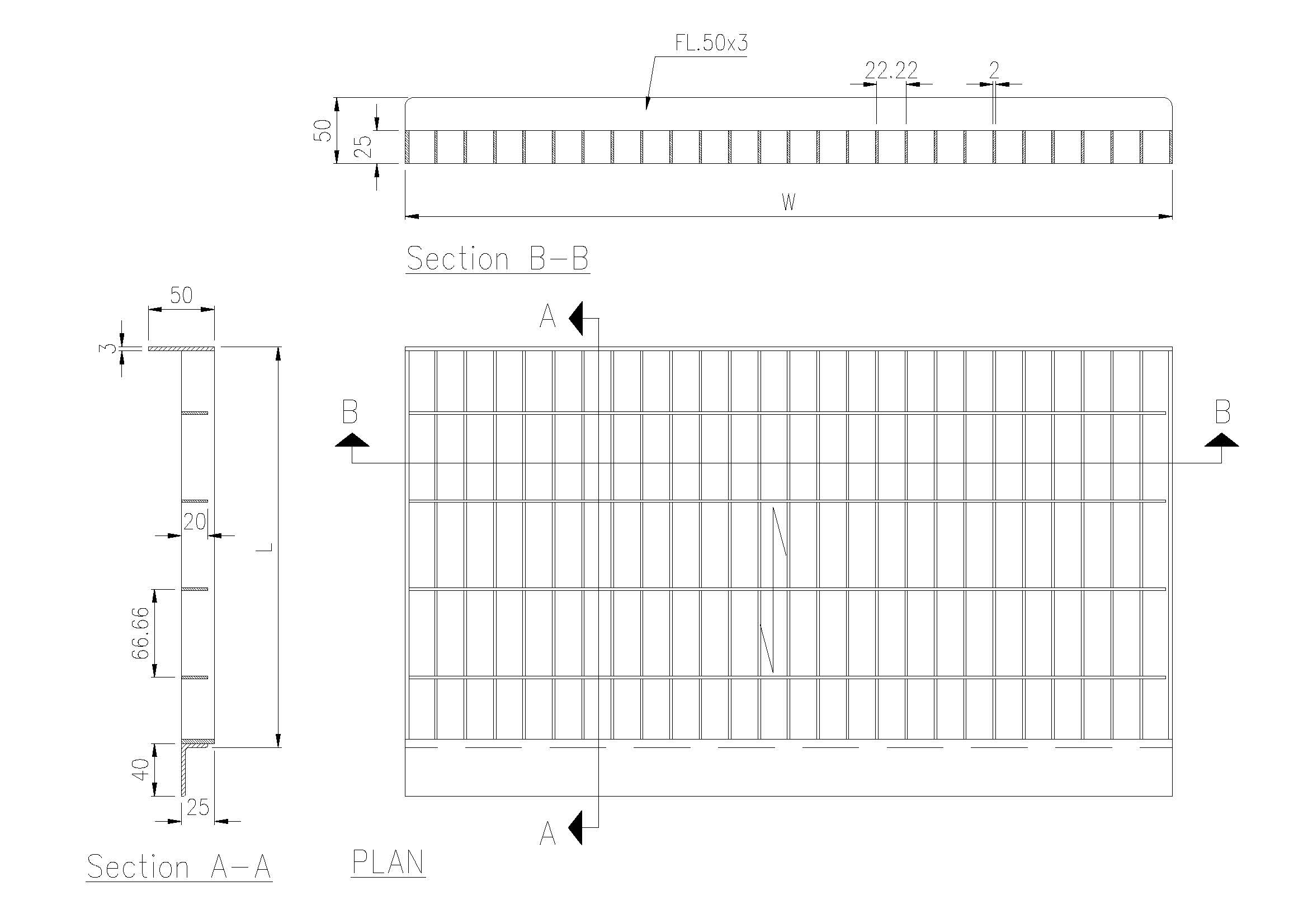 Single grating for installation in a precast light well with a supporting edge on three sides.